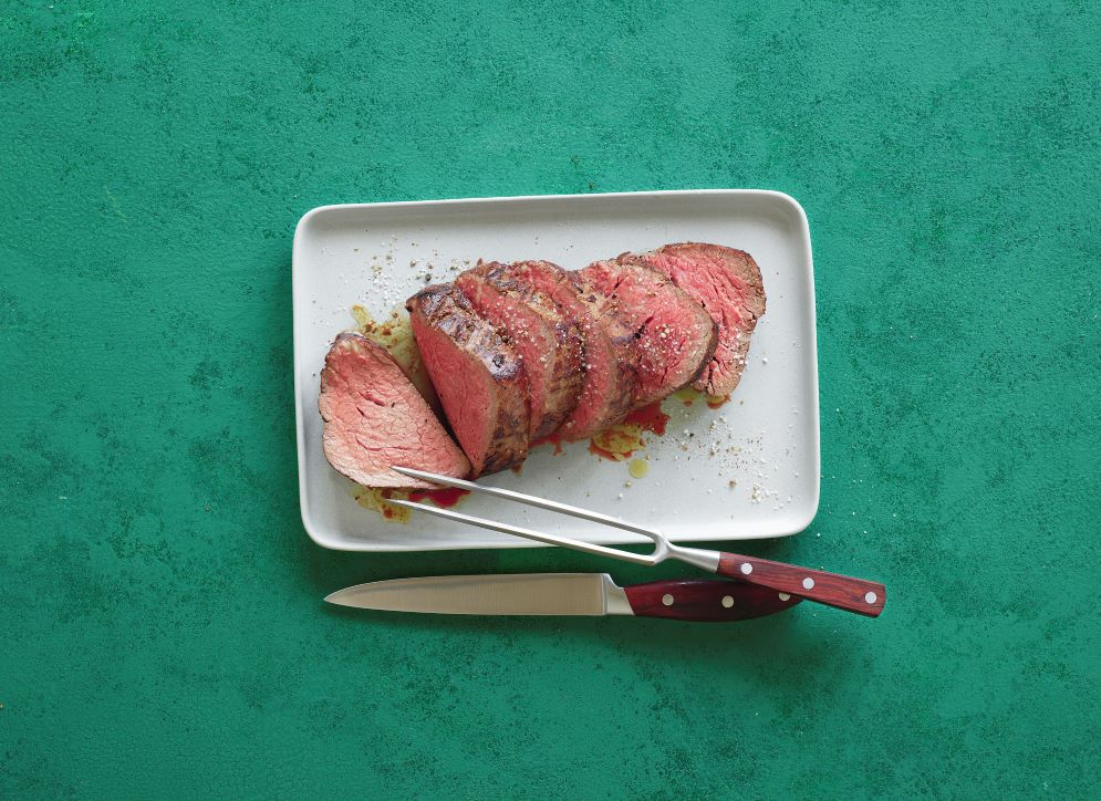 Ingredienti (per 4 persone): 1 cc di fleur de sel; ½ cc di pepe nero macinato fresco; 1 filetto di manzo al pezzo di circa 800 g (ricavato dalla parte centrale); 2 noci di burro per arrostire. Salsa béarnaise: 1 scalogno; 1 mazzetto di dragoncello*; 200 g di burro; ½ cc di pepe macinato grossolanamente; 3 c d’aceto di vino bianco; 1 dl di vino bianco; 3 tuorli freschi; sale; 1 cc di succo di limone