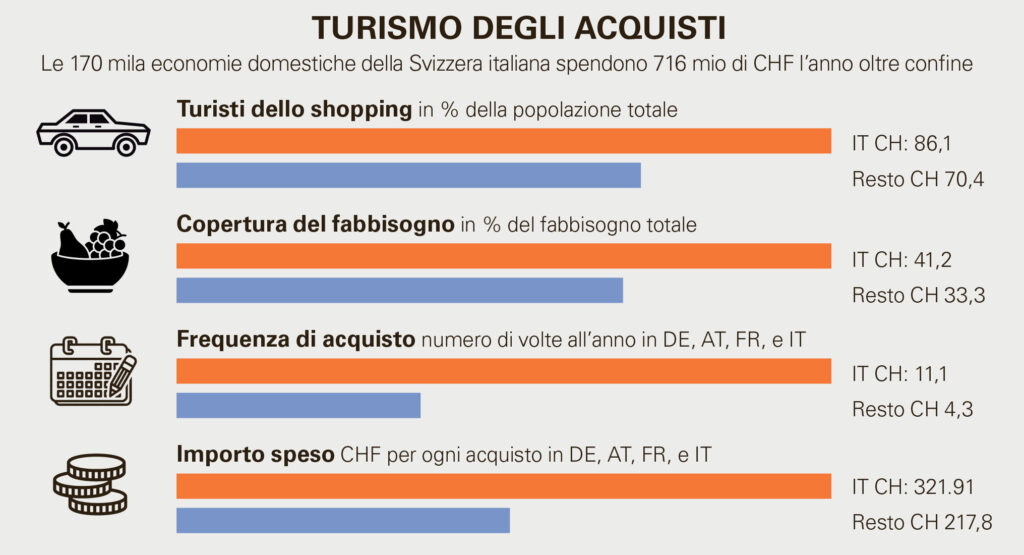 Con circa 170’000 economie domestiche, il Ticino registra tassi di penetrazione della spesa in Italia impressionanti: l’80,2% delle famiglie compra alimentari oltreconfine, il 46,8% prodotti nell’ambito della drogheria, il 49% nell’abbigliamento, il 24,5% negli articoli sportivi e il 27% nell’arredamento. Anche la frequenza della spesa nella vicina penisola è significativa: si calcolano 16,3 viaggi all’anno per alimentari e drogheria, 3 o 4 per comprare vestiti o articoli sportivi, quasi 3 per l’arredamento. Insomma, il carrello della spesa ticinese varca regolarmente la frontiera.