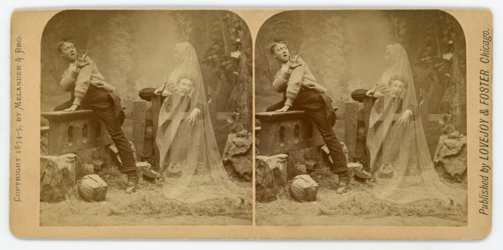 Non è però solo in ambito letterario e pittorico che si aggiravano i fantasmi ottocenteschi. Intorno alla metà dell’Ottocento fu infatti l’allora nascente linguaggio fotografico, che permetteva di fissare su un supporto l’immaterialità evanescente dei fenomeni luminosi, a offrire a medium, spiritisti e scienziati dell’occulto lo strumento perfetto per cercare di dare finalmente visibilità al mondo del soprannaturale.