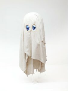 Sono questi i fantasmi che popolano soprattutto la seconda parte della mostra nella quale, a parte qualche eccezione (Max Ernst, Rene Magritte, Marcel Duchamp, Meret Oppenheim, Sigmar Polke e Mike Kelley) troviamo soprattutto opere realizzate negli ultimi trent’anni. Tra queste, due si impongono sulle altre. La prima è costituita dal maestoso fantasma di Katarina Fritsche sospeso sopra una pozza di sangue a dare corpo a una delle tante vittime di violenza del nostro tempo. Un fantasma che, come tutti i fantasmi, potrà placarsi e liberarci della sua inquietante presenza solo quando otterrà finalmente giustizia. La seconda, quella che è stata scelta come immagine simbolo della mostra, è il Fantasmino di Tony Oursler. Anche in questo caso l’artista gioca con l’iconografia tradizionale proponendoci una scultura di una minuscola creatura nascosta sotto un telo bianco bucato in prossimità degli occhi. Lo sguardo umano triste e melanconico di questo essere misterioso non è altro che un’immagine video riprodotta su uno schermo celato sotto il telo.