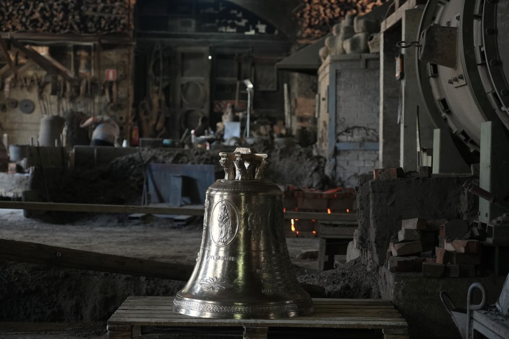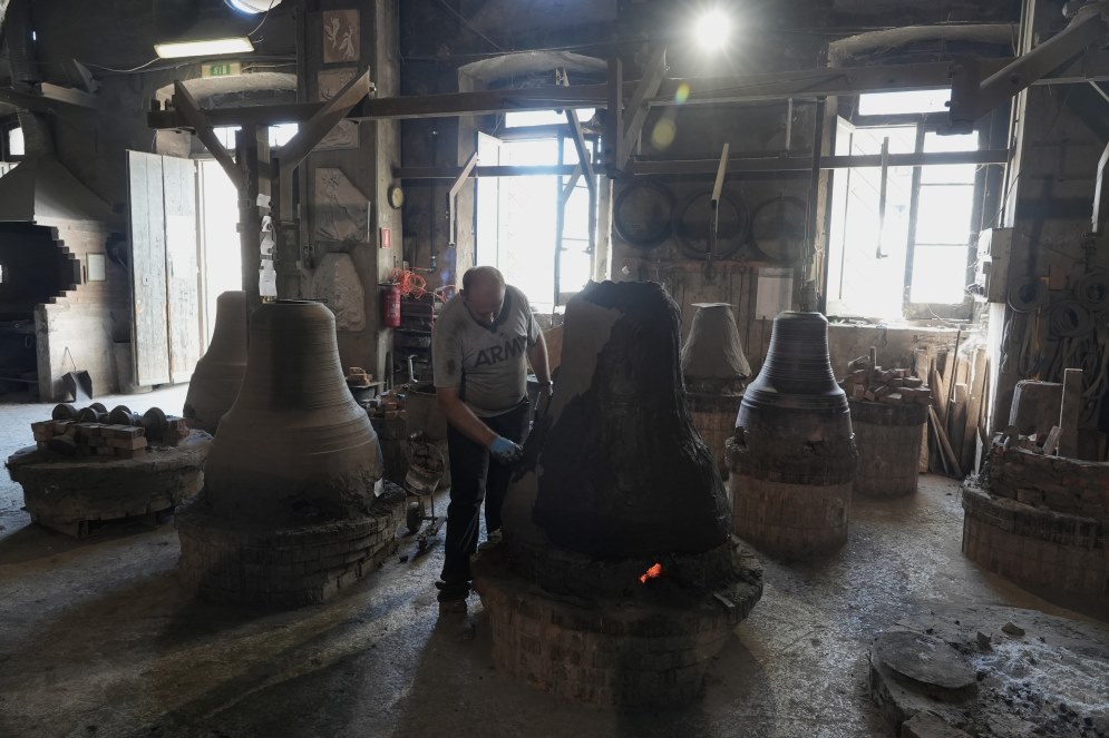 Si sposta un po’ di lato e poi continua: «Prima si costruisce il modello della futura campana che è fatto dall’anima e cioè una forma fatta di mattoni ricoperti d’argilla che rappresenta l’interno della campana. Poi sopra l’anima si costruisce la falsa campana, con vari strati d’argilla dove si applicano le iscrizioni e le immagini in cera. Infine sopra la falsa campana si costruisce il mantello, composto da altri strati di argilla di diversa consistenza». Si ferma un attimo, prende fiato. Dalla sua voce si percepisce, ancora oggi che è in pensione, la grande passione per le campane. «Dal buco lasciato in alto nel modello si butta all’interno della brace e si cuoce con la tecnica della cera persa, ed è per questo che senti questo odore nell’aria. Il calore scioglie la cera lasciando impresse le immagini sul mantello d’argilla. Quindi si solleva il mantello, si rompe la falsa campana e si ricolloca il mantello sull’anima. Poi il tutto viene interrato nel fosso di colata, dove il bronzo fuso viene versato nelle forme e va a riempire lo spazio tra anima e mantello. Quando tutto si sarà raffreddato, tiriamo fuori la campana, togliamo l’anima, rompiamo il mantello ed ecco la vera e propria campana. Ed ognuna è diversa dall’altra per dimensioni e suono».