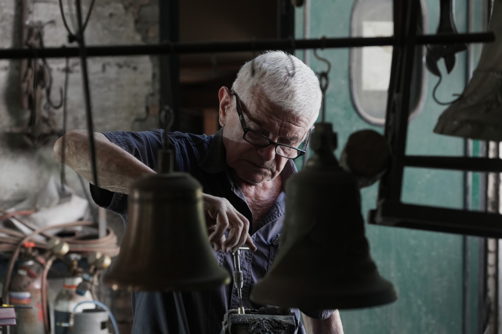 Dall’altro lato, giù in fondo all’ex fienile, altri operai sono intenti alla lucidatura delle campane, grandi o piccole che siano. Piegati su banconi di legno, con movimenti meticolosi spazzolano e lucidano l’ottone, «perché anche queste piccole sono fatte artigianalmente» mi informa un operaio mentre segue attentamente il lavoro di Amedeo, 17 anni, la nuova generazione dei Marinelli. Figlio di Pasquale è entrato in fonderia all’età di 12 anni, «ma già da piccolo, a tre o quattro anni giocava qui dentro e respirava la polvere e il fumo della fonderia» mi dice mentre è piegato sul bancone a ripulire una piccola campana.