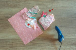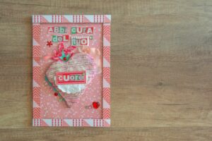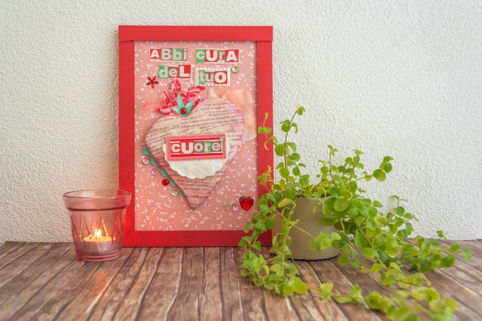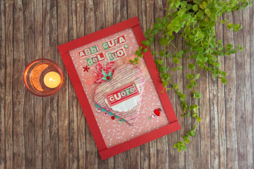 Rivestite la base del quadretto e i profili che formeranno la cornice con un cartoncino decorato, fissate tutto con la colla. Posizionate il cuore e le scritte sulla vostra base e quando sarete soddisfatti della composizione incollatela saldamente.