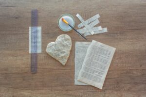 Dipingete ora il cuore con velature leggere di acquerello. Lasciate intravedere il testo delle pagine sottostanti. Decoratelo a piacere aggiungendo dettagli in cartone, passamanerie, strass e tutto ciò che la fantasia vi suggerisce.