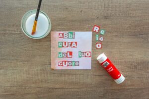Nel frattempo, ritagliate singole lettere da giornali e riviste. Incollatele su un cartoncino per formare le parole desiderate. Una volta asciutte, ritagliate le singole parole.