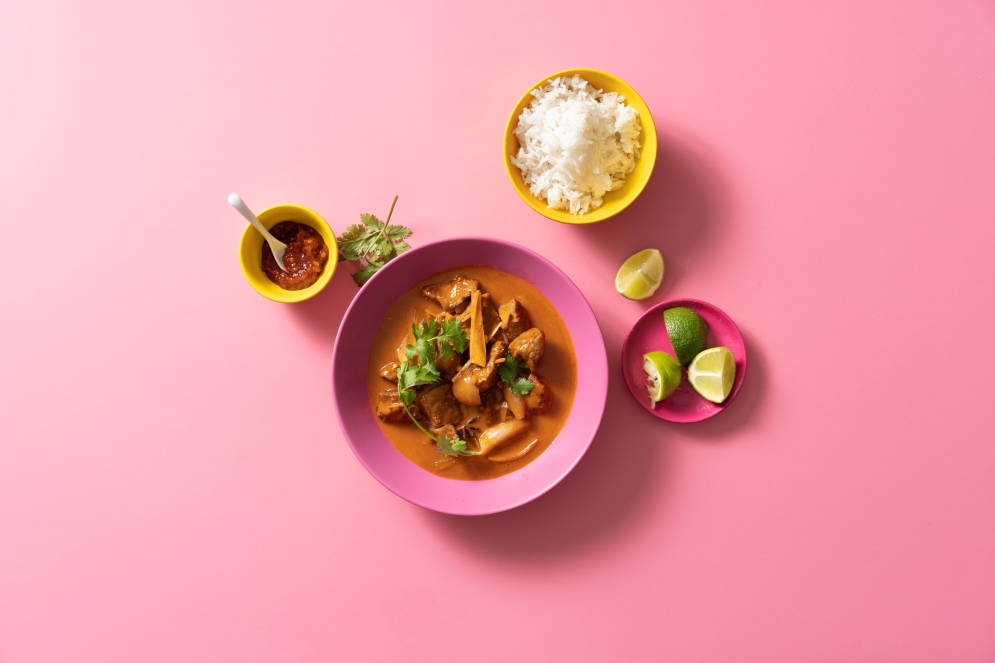 Ingredienti (per 4 persone): 2 scalogni; 2 spicchi d’aglio; 1 fetta di zenzero di 3 cm; 2 gambi di lemongrass; 700 g di spezzatino di manzo; 2 c d’olio d’arachidi; 1 cc di sale; pepe; 2 c di concentrato di pomodoro; 1 anice stellato; 1 chiodo di garofano; 2 cm circa di bastoncino di cannella; 3 c circa di salsa pad thai (vedi suggerimento); 4 dl di brodo di manzo; 2,5 dl di latte di cocco; 1 limetta; 4 rametti di coriandolo