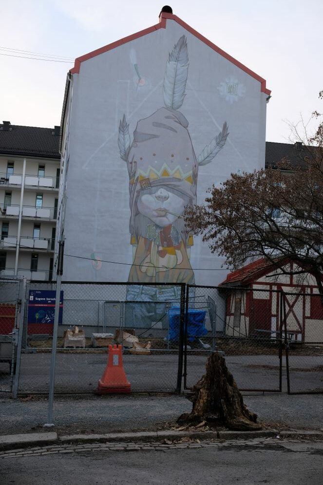 Continuando a piedi sulla Thorvald Meyers gate si arriva a Sagene, nella vecchia zona industriale di Oslo e dove scorre l’Akerselva che divide in due la città norvegese. Qui si incontrano i bizzarri murales di Zed 1 nome d’arte di Marco Buressi, e il bellissimo L’ultimo mohicano del polacco Przemyslawk Blejzy (Sainer), che mescola realismo e fiaba, ma anche le forme geometriche tridimensionali molto colorate del russo Wais.