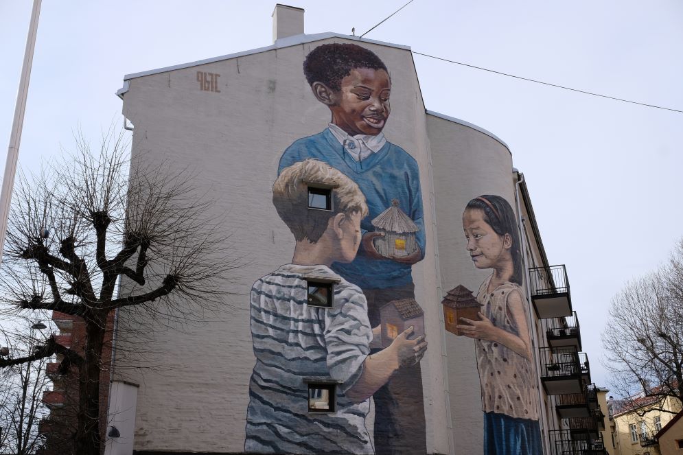 Da Majorstuen arriviamo in metropolitana a Toyen, che era il quartiere dei lavoratori, vicino all’orto botanico con la flora alpina più importante d’Europa. Nel rione popolare alcuni murali stanno sulle facciate degli edifici che si trovano vicino a un plesso scolastico, quello molto colorato in Sørligata 46 copre completamente gli esterni di un palazzo raffigurante tre bambini – uno europeo, uno africano e una bambina asiatica – che tengono in mano i modellini degli edifici dei loro Paesi di provenienza. «La mia casa è la tua casa» è un’opera del 2017, disegnata da un artista russo dell’iperrealismo sociale, Rustam Qbic; ha un effetto di rispecchiamento con il vociare allegro dei bambini che stanno giocando nel cortile adiacente, anche loro di etnie diverse, molti dei quali africani.