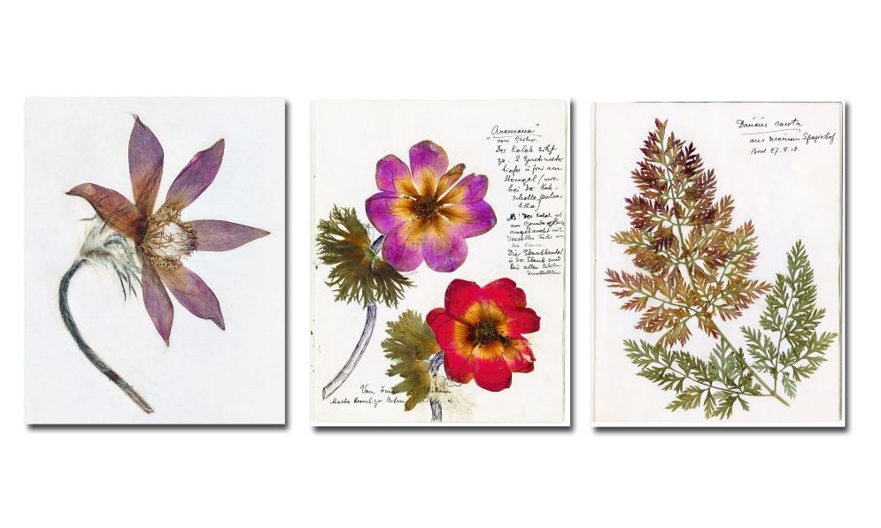 Gli erbari amatoriali sono realizzati con la vegetazione raccolta nei cortili delle varie prigioni o nelle vicinanze. In quello dell’infermeria del carcere di Berlino vi era un orto con verdure ed erbe aromatiche, ma anche delle galline. Gli erbari ci raccontano delle piante esistenti ai suoi tempi e ci aiutano a immaginare dove potevano crescere per ammirarne i colori e cercare di comprendere cosa viveva in quelle carceri: un’edera, una splendida anemone, una delicata malva, un asparagus…