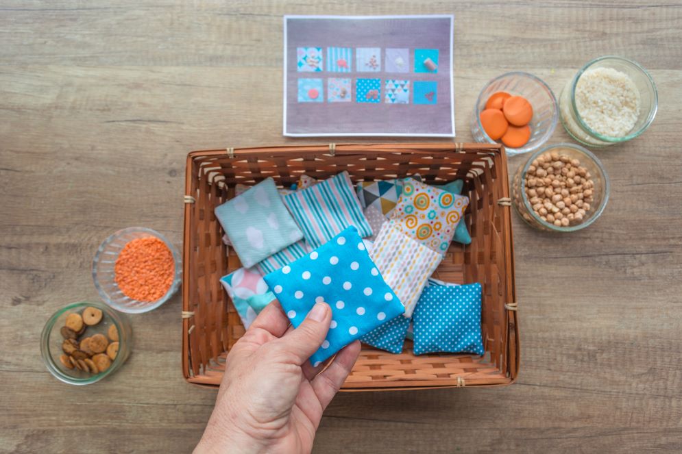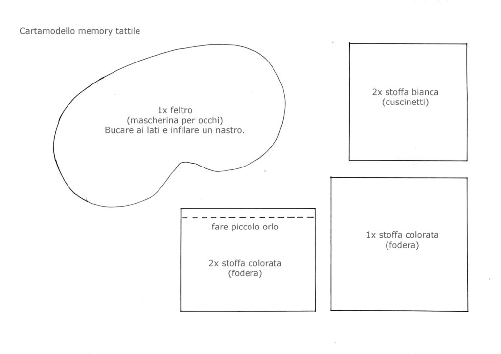 Potete inserire i cuscinetti all’interno di un sacchetto, oppure realizzare una piccola maschera in feltro per bendare il giocatore (in alternativa potete usare anche un semplice foulard). In questo modo sarà possibile disporre i cuscinetti in una cesta e maneggiarli più liberamente, concentrandosi esclusivamente sull’esplorazione tattile.