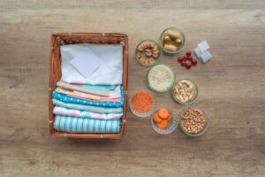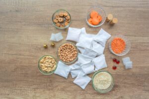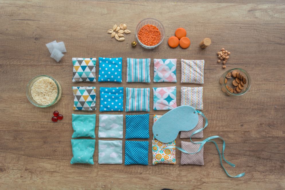 Scelte le stoffe, abbinate a ciascuna un materiale e scattate una fotografia. Questo vi servirà per avere un’immagine di riferimento, utile nel caso vogliate giocare anche a indovinare quale elemento è contenuto all’interno dei cuscinetti. O per soddisfare la curiosità di chi vi giocherà . A questo punto inserite i materiali e cucite il quarto lato.
