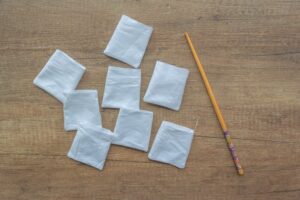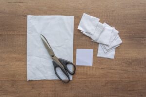 Dal tessuto bianco ricavate dei quadrati tutti della stessa dimensione (es. 7×7 cm). Serviranno due pezzi di stoffa per ogni cuscinetto, 4 per ogni coppia. Per farlo potete utilizzare come riferimento il cartamodello.