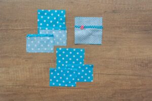Preparate le fodere. Per ogni fodera tagliate 1 quadrato 8 x 8 cm e 2 rettangoli 8 x 6 cm. Come prima cosa, create un piccolo orlo su uno dei lati lunghi di ciascun rettangolo. Successivamente, sovrapponete i due rettangoli al quadrato, dritto contro dritto, facendo in modo che i lati con l’orlo siano rivolti verso il centro (vedi fotografia). Cucite lungo tutti e quattro i lati e poi risvoltate il lavoro. Una volta pronte le fodere colorate, inserite al loro interno le coppie di cuscinetti sensoriali.