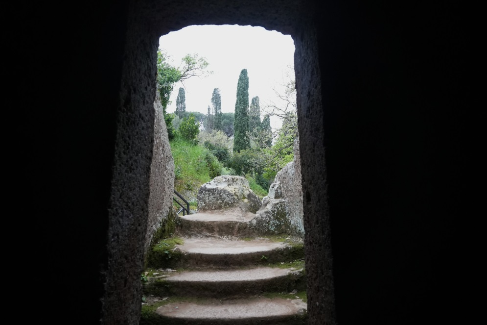 Abbandono la simpatica coppia e mi inoltro lungo le stradine della necropoli, sbircio dentro diverse tombe, alcune molto semplici (nient’altro che un grande buco scavato nel tufo), mentre altre sono più imponenti e ricordano una vera e propria casa: al loro interno ci sono diverse camere mortuarie. I grandi tumuli circolari sono ricoperti di terra rendendo il tutto più monumentale. E più era importante la famiglia più grande era il tumulo. Questo anche perché chi dalla città guardava la necropoli, poteva ben distinguere le tombe più illustri.