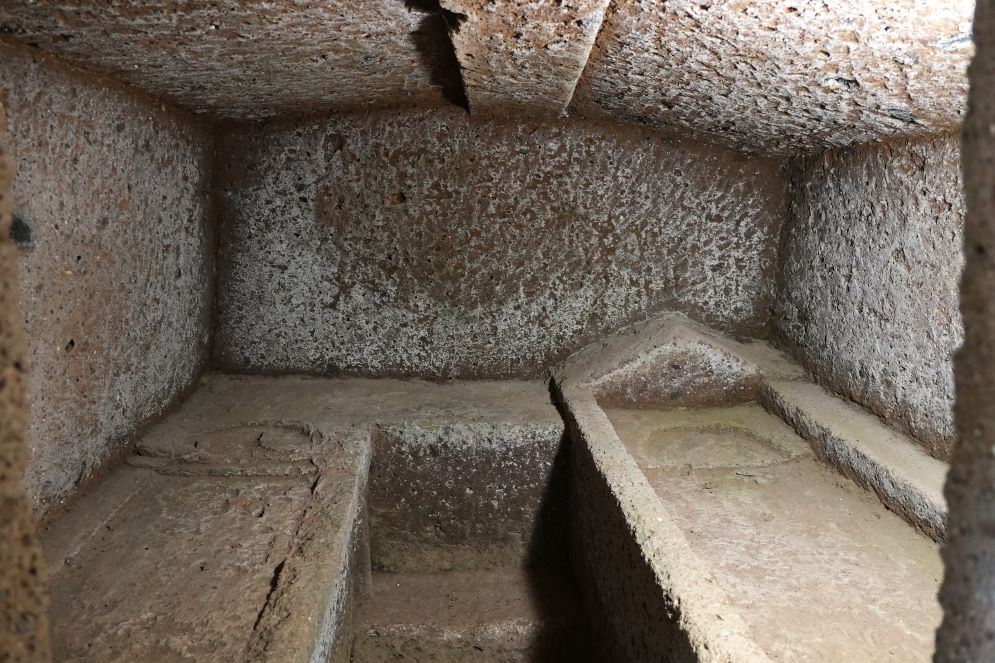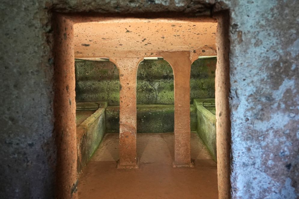 Se da fuori si mostra con la classica cupola, è il suo interno a stupire. E così, dopo aver sceso una ripida scala di metallo, da dietro una porta a vetri che vieta l’ingresso e protegge la tomba ma permette di vederne l’interno, dopo aver cliccato sull’interruttore e aver acceso la luce, ecco che ci appare una vera e propria opera d’arte. Si possono ammirare le pareti, adorne di disegni e, appunto, rilievi di stucco. In generale l’architettura delle tombe rappresentava in qualche modo la casa di quando il defunto era in vita, mentre questa è l’unica dove sono riprodotti fedelmente sulle pareti gli oggetti del morto come elmi, scudi, spade e quelli di uso domestico come vasi, strumenti di lavoro, borse: «Questi mica sono qui per caso» dice sempre Nello, mentre appoggia il viso sul vetro per vedere meglio l’interno. «Questa è la tomba del nobile Vel Matunas e della sua famiglia».