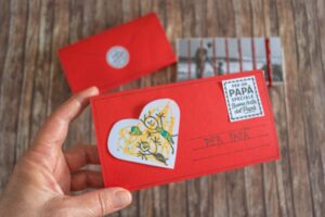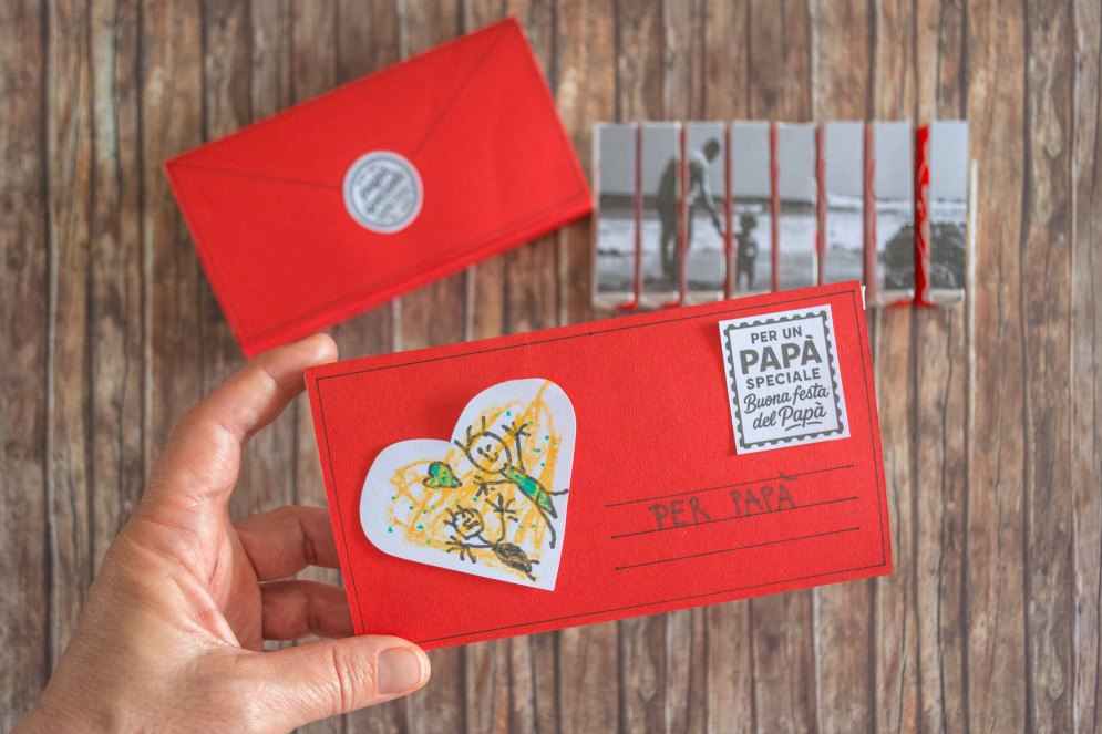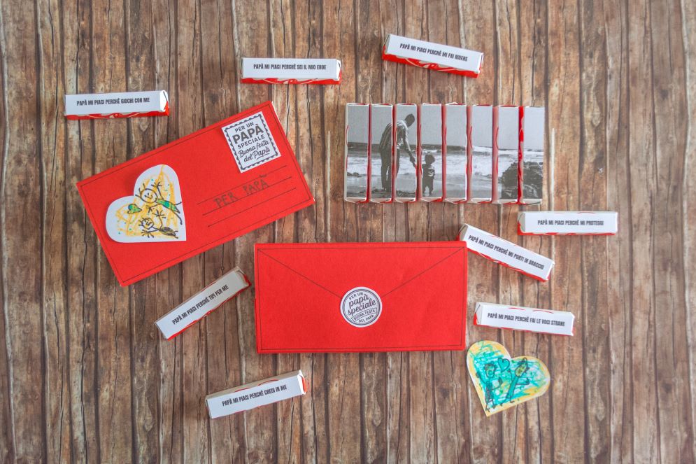 Un progetto semplice per realizzare una sorpresa per la festa del papà . Una confezione di cioccolatini personalizzata che diventa un puzzle fotografico o, in alternativa, una raccolta di frasi dedicate. La scatola viene trasformata in una busta-lettera, arricchita da dettagli disegnati a mano e da un cuore decorato dal bambino. Un progetto perfetto anche come cartolina d’auguri emozionale.