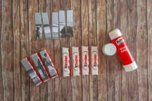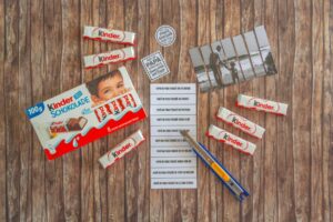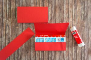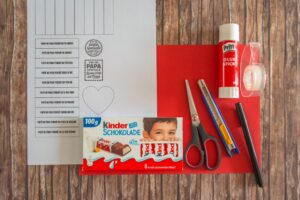 Se il bambino sa già scrivere naturalmente sarà più d’impatto lasciare che prepari e scriva lui stesso le frasi. Prendete la confezione dei cioccolatini e rivestitela completamente con un foglio rosso A4 da 80 gr, aiutandovi con la colla o il nastro adesivo. Vi basterà tagliare il foglio alla larghezza della confezione e avvolgerlo attorno alla tavoletta tagliando l’eventuale eccedenza.