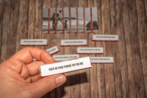 Se preferite la versione solo con frasi, stampate o scrivete le frasi «Papà mi piaci perché…» su foglio A4 bianco da 120 gr e ritagliate ogni frase in strisce della stessa misura delle barrette.