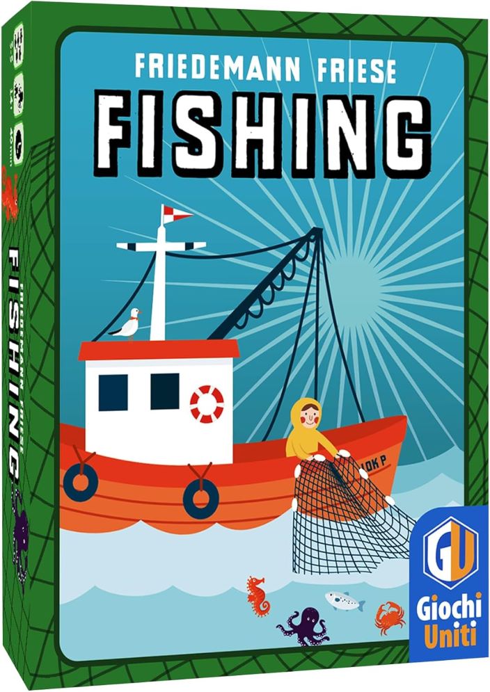 Alla seconda categoria appartiene Fishing, creato da Friedemann Friese nel 2024 per 2F-Spiele (in italiano: Giochi Uniti, 2025). Dura un quarto d’ora e accoglie da 3 a 5 partecipanti. L’ambientazione sembra restituire il mondo della pesca di cui stiamo parlando, ma si tratta in sostanza di un derivato dalla classica briscola. Con una novità: ogni mano si gioca usando le carte prese in quella precedenza (e messe nel proprio «peschereccio»). Chi non ne ha prese abbastanza, pesca nuove carte da un mazzetto (chiamato «Oceano»), e queste carte sono sempre più forti di quelle già in circolazione. Questo è geniale, perché implica che, se si vince sempre, non si avranno più delle carte potenti. Per essere i vincitori alla fine occorre dunque pianificare di perdere alcune mani durante la partita, al momento giusto.