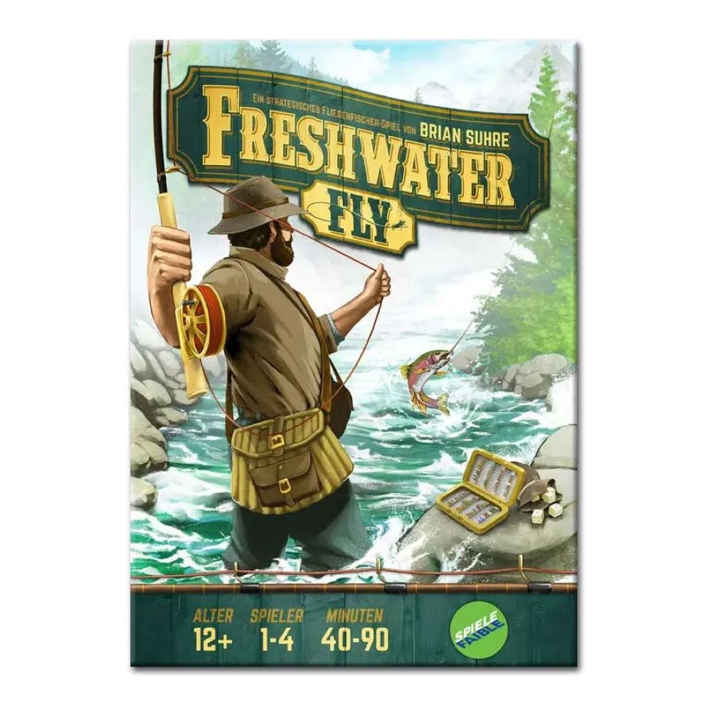 Se Fishing è un piccolo, ingegnoso gioco astratto, altri titoli mettono l’accento sulla simulazione. Segnalo fra gli altri Freshwater Fly di Brian Suhre (Bellwether Games, 2019). Qui si tratta di escogitare una strategia a partire dal lancio di un certo numero di dadi, fra i quali i partecipanti (da 1 a 4) devono sceglierne uno, lasciando i restanti agli avversari. A seconda della cifra sul dado, si potranno svolgere una serie di azioni diverse: lanciare la propria esca, riavvolgere la lenza, migliorare la propria abilità.