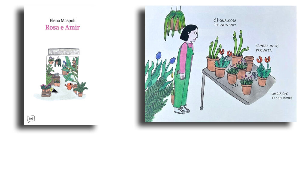 Rosa e Amir, di Elena Maspoli, racconta una sequenza di momenti significativi per il binomio del titolo. Nel giro di tre scene diventa chiaro il problema che i due si trovano ad affrontare, e il modo in cui lo risolvono: in questo somigliano a tutte le coppie, ma nel loro caso ci sono differenze culturali, manifestate sia in sensibilità diverse – soprattutto per temi che riguardano la sessualità – sia nella paura del giudizio dell’altro. In particolare scopriamo le insicurezze di Rosa, fiorista che si confida con le piante del suo negozio, che a loro volta danno voce a dubbi e insinuazioni che in realtà la donna vorrebbe mettere a tacere. I disegni sono molto stilizzati, simili a illustrazioni di libri per l’infanzia: acquarelli tenui, contorni fini, sfondi spesso suggeriti quanto basta da qualche elemento posizionato nel bianco della pagina. Semplicità e delicatezza che favoriscono la concentrazione sulle emozioni e relazioni dei personaggi.