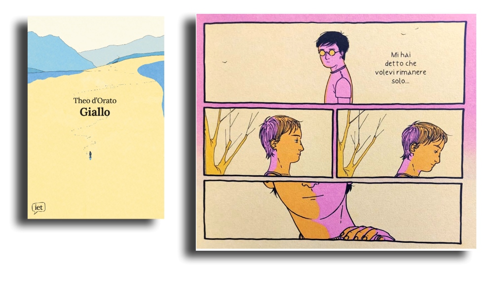 Theo d’Orato fin dal titolo – Giallo – dichiara quale nota cromatica prevalga nelle sue pagine, anche se sempre combinata con altre tonalità minoritarie, come azzurro, verde e arancione, per distinguere gli elementi in scena e i loro livelli di profondità e luminosità . Ne deriva una colorazione leggibile, armonica, ma anche irrealistica e soggettiva, come si addice agli eventi che si svolgono unicamente nell’interiorità del protagonista. In realtà , infatti, accade ben poco: a riempire le vignette sono soprattutto emozioni, atmosfere e ricordi evocati nel discorso tra due giovani uomini.