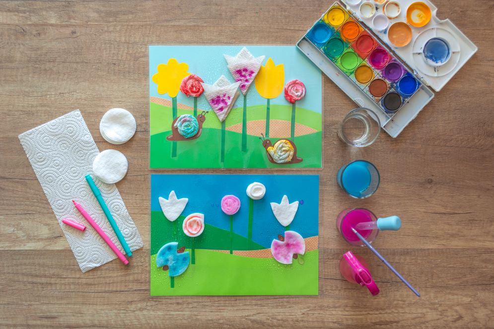 Ora che avete preparato un primo fondale, il consiglio è quello di sperimentare mettendo a disposizione materiali e supporti diversi. Potete utilizzare, per esempio, dei dischetti di ovatta al posto della carta da cucina, oppure la stessa carta piegata in modi differenti e con più o meno strati.