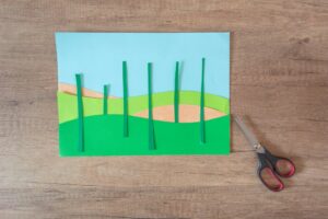 Su un cartoncino A4 azzurro, che fungerà da sfondo, incollate alcune colline ondulate ritagliate da cartoncini verdi e beige per creare il prato. Aggiungete poi gli steli dei fiori, ritagliandoli dal cartoncino verde e disponendoli sul prato a diverse altezze, in modo da rendere la composizione più varia.