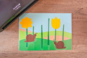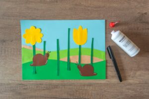 Aggiungete al vostro collage due lumachine e alcuni fiori che trovate sul cartamodello, oppure altri piccoli elementi decorativi che la fantasia vi suggerisce. Se necessario, completate il disegno tracciando con un pennarello i dettagli più fini, come gli occhi, le antenne o altri particolari.