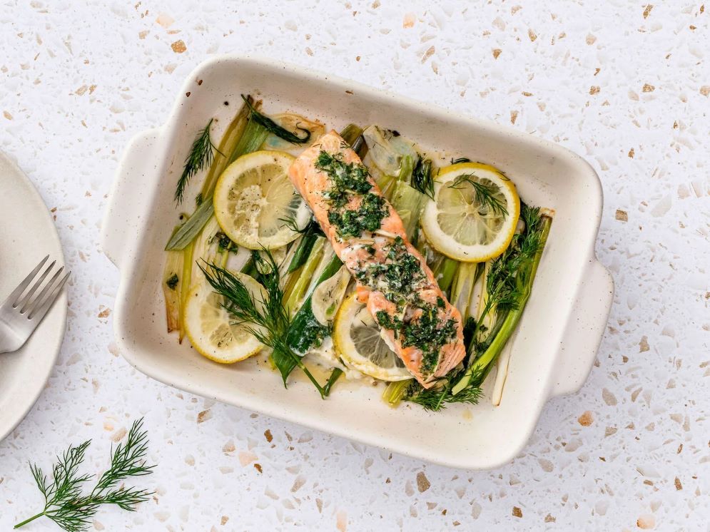 Ingredienti (per 4 persone): 6-8 cipollotti; ¼ di limone; 4 spicchi d’aglio; ¼ di mazzetto d’aneto; ½ mazzetto d’erba cipollina; 80 g di burro, morbido; 1 cc di sale; 4 Filetti di salmone senza pelle da circa 150 g l’uno; sale per condire; pepe